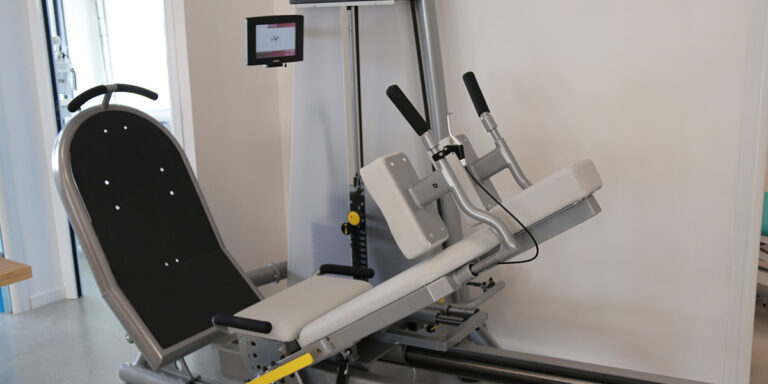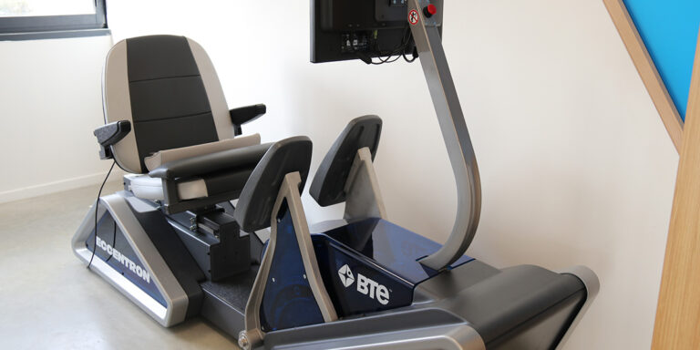 Eccentron de BTE permet une évaluation et un renforcement musculaire, uniquement en excentrique. Ce renforcement en chaine cinétique fermée grâce à ce compromis entre un ergomètre excentrique et une presse horizontale excentrique.
