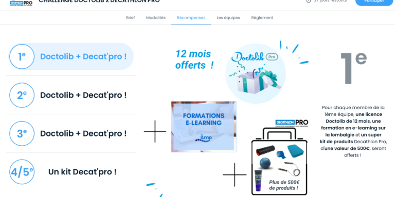 Doctolib + Décathlon Pro + ITMP Un Défi Plus de 70% de la population française est touchée par la lombalgie est un problème de santé publique. Tu es étudiant.e en kinésithérapie ou tu exerces déjà ? Ce challenge est fait pour toi ! Votre défi en tant que (futur) kinésithérapeute ? Réinventer le traitement de la…