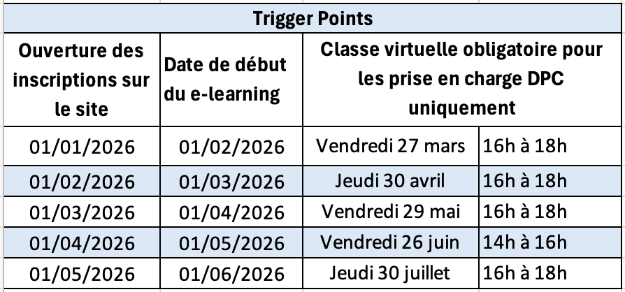- Durée de formation : 14 heures en e-learning et une classe virtuelle obligatoire uniquement pour les financements DPC